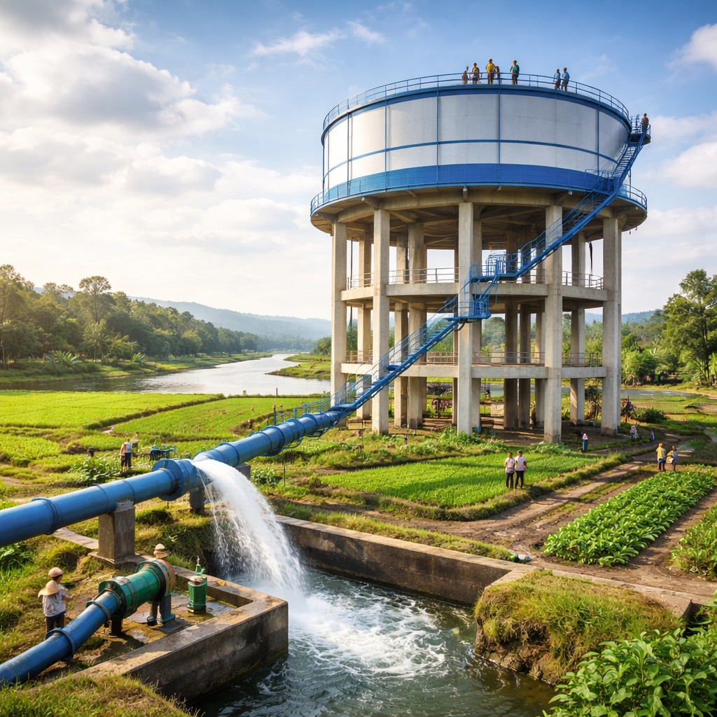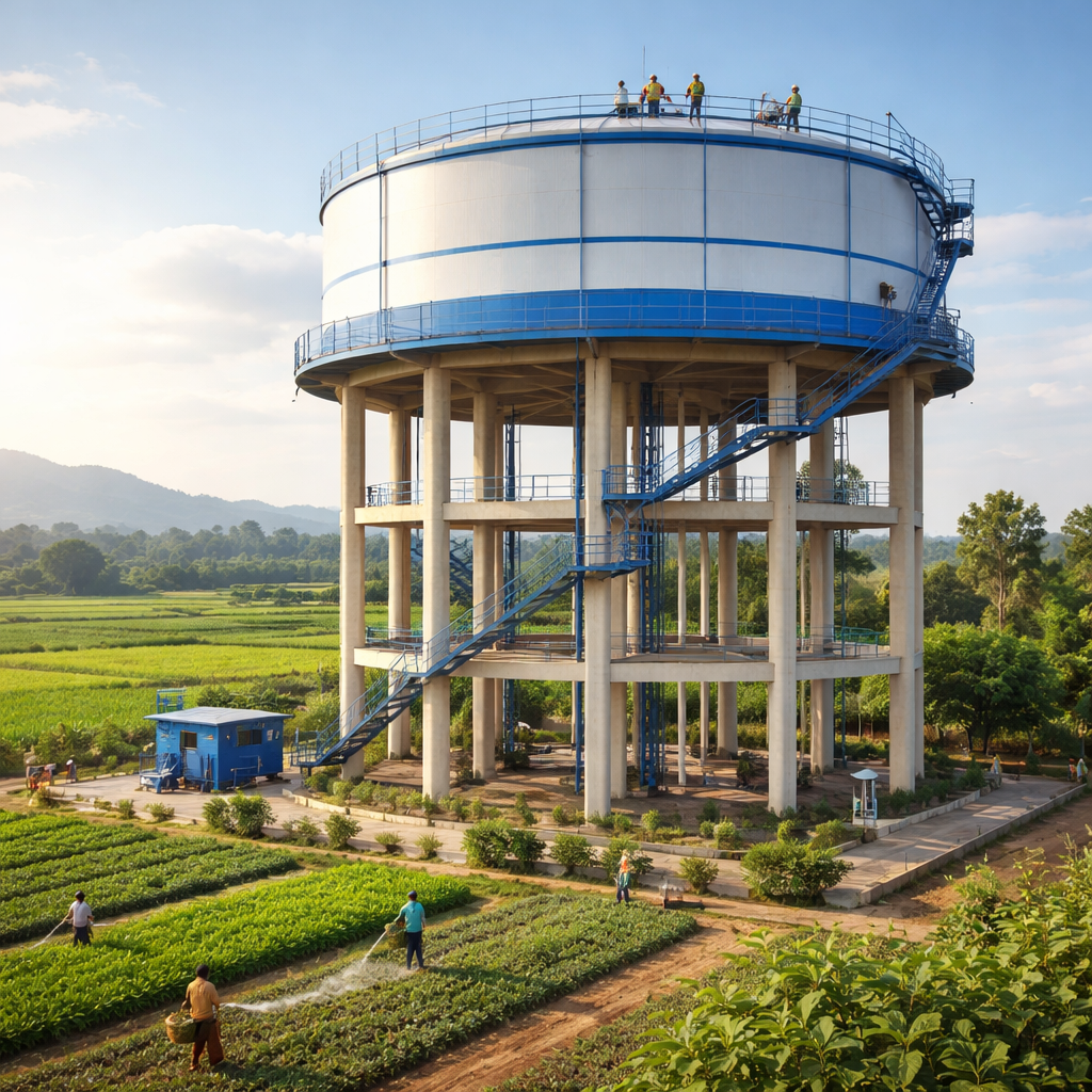 Overhead tanks maintain steady water pressure, ensuring continuous water availability for irrigation, processing, and distribution.
